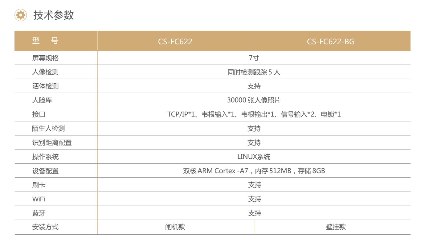 CS-FC622/-BG是一款高性能、高可靠性的人像識別產(chǎn)品,依托 深度學(xué)習算法,具有識別速度快、準確率高的特點(diǎn)。支持人像識 別 1:1 和 1:N 模式,支持外接刷卡。 應用場(chǎng)景: 工地實(shí)名制通道、學(xué)校、社區、寫(xiě)字樓、酒店、商場(chǎng)、 商店、 公共服務(wù)場(chǎng)所等。